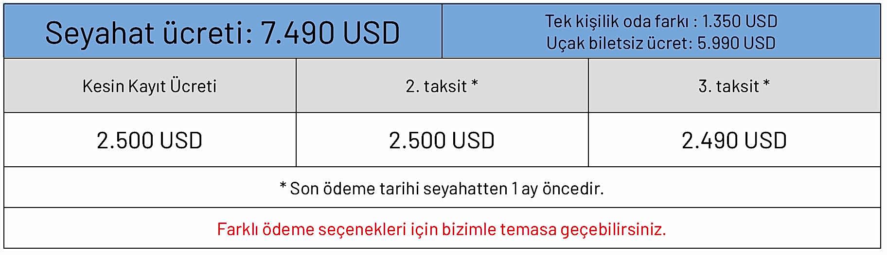 Bu seyahatte konaklayacağımız otellerin listesini aşağıda bulabilirsiniz.