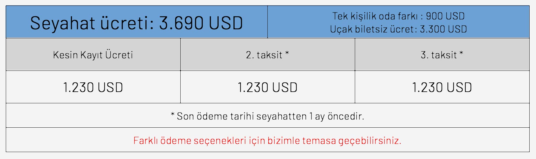 Bu seyahatte konaklayacağımız otellerin listesini aşağıda bulabilirsiniz.
